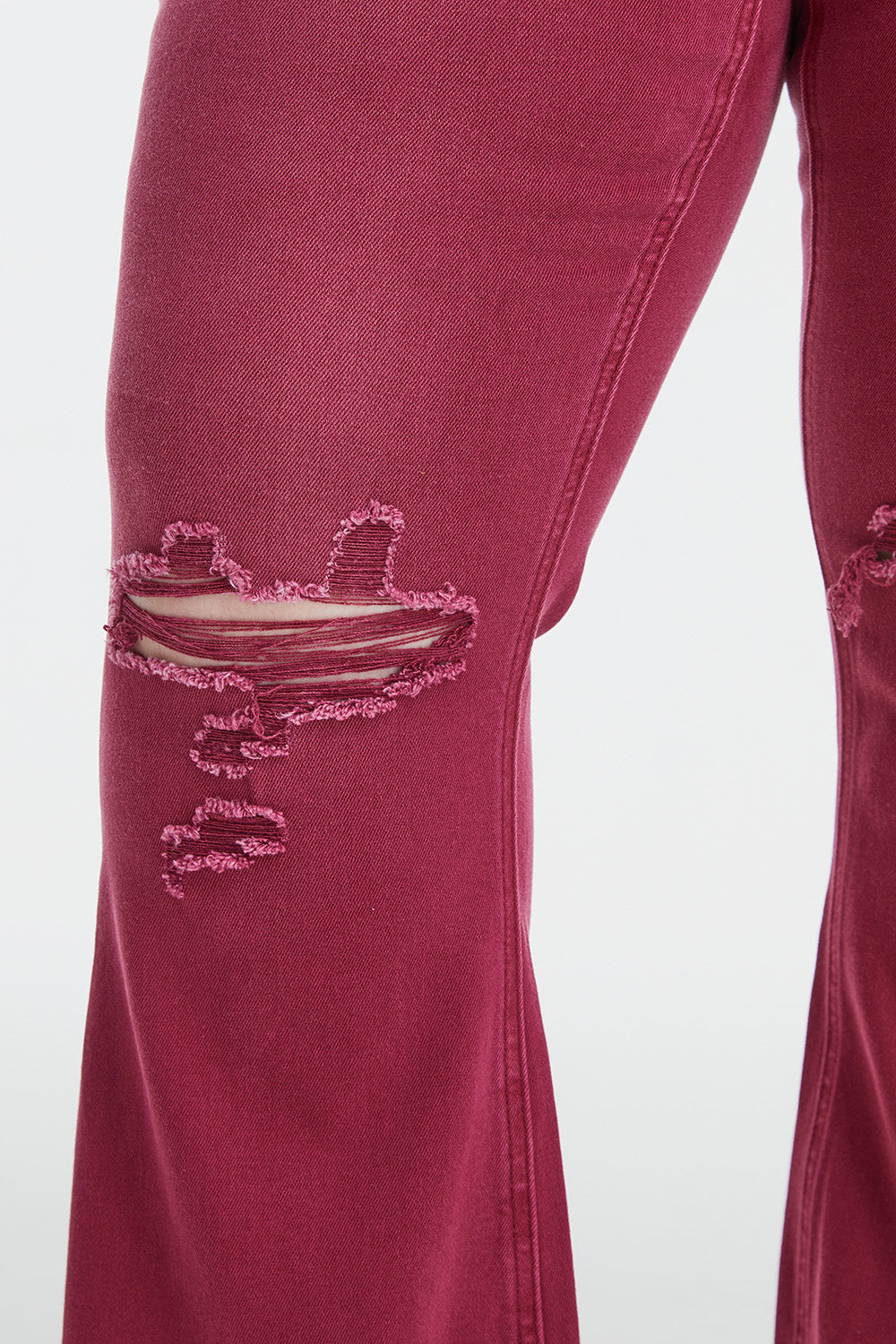 Introducing our High-Waisted Flared Trousers in a beautiful rose pink hue. These trousers offer a stylish and feminine touch to any ensemble. The high-waisted design accentuates your curves and creates a flattering silhouette. What sets these trousers apart is the unique distressed effect at the knees and hem, adding a hint of edginess and personality. Whether you're dressing up for a special occasion or creating a chic everyday look, these flared trousers will elevate your style. Pair them with a fitted blouse and heels for a sophisticated outfit, or dress them down with a casual tee and sneakers for a more relaxed vibe. Versatile and trendy, these high-waisted flared trousers are a must-have addition to your wardrobe.