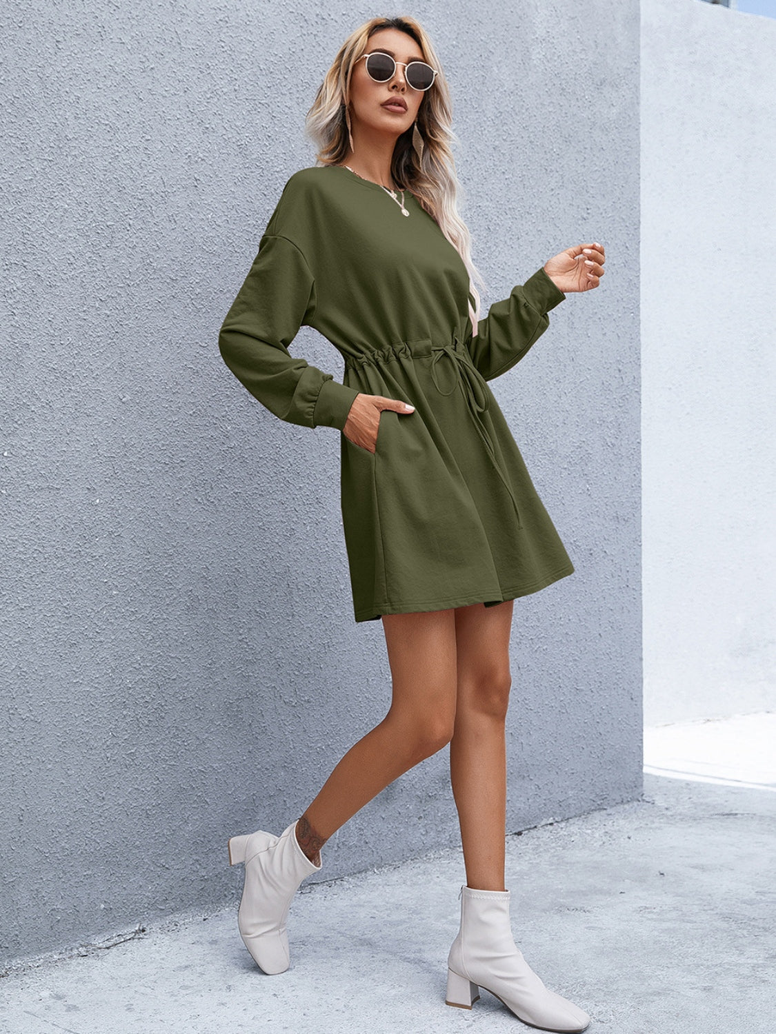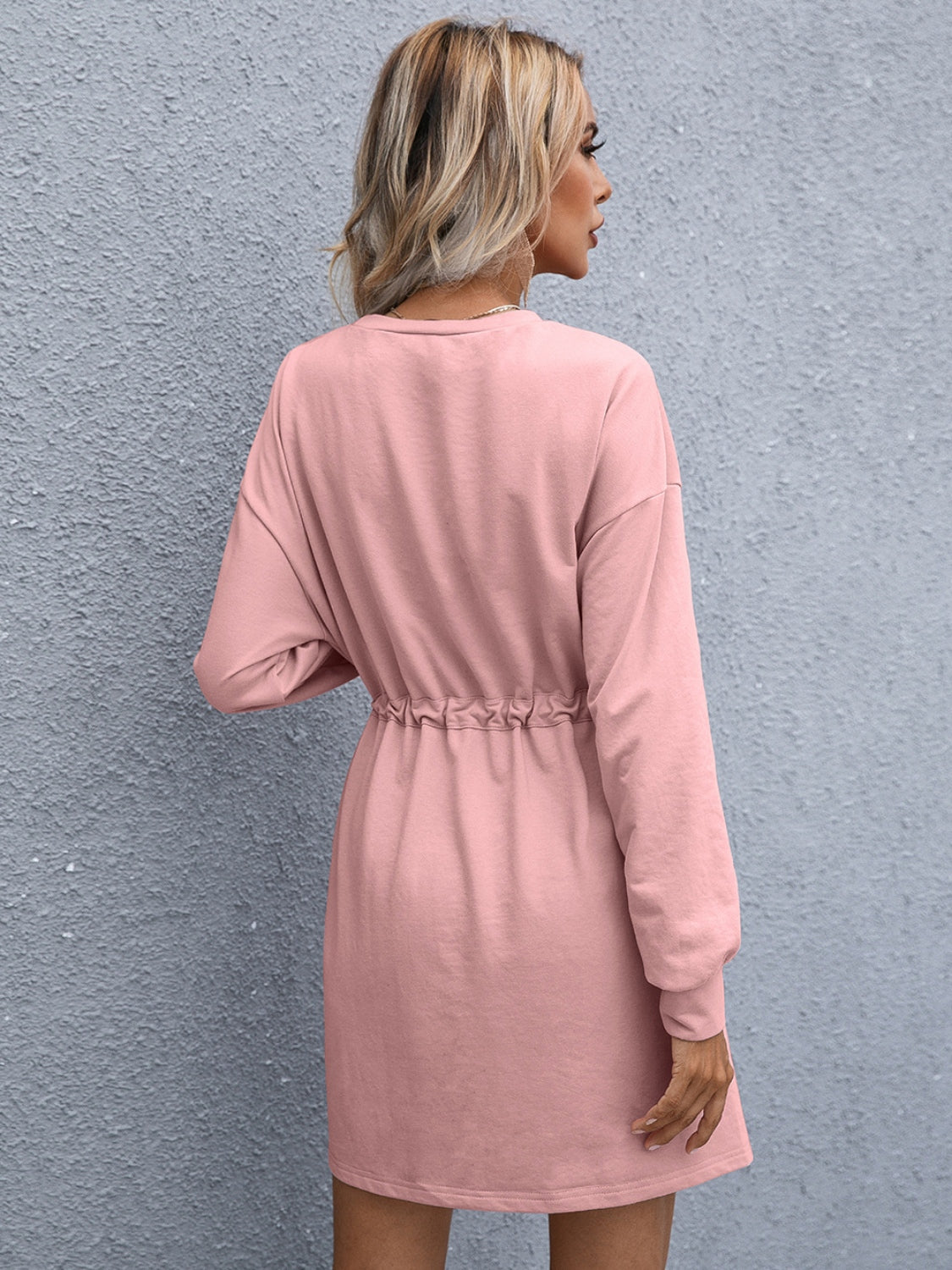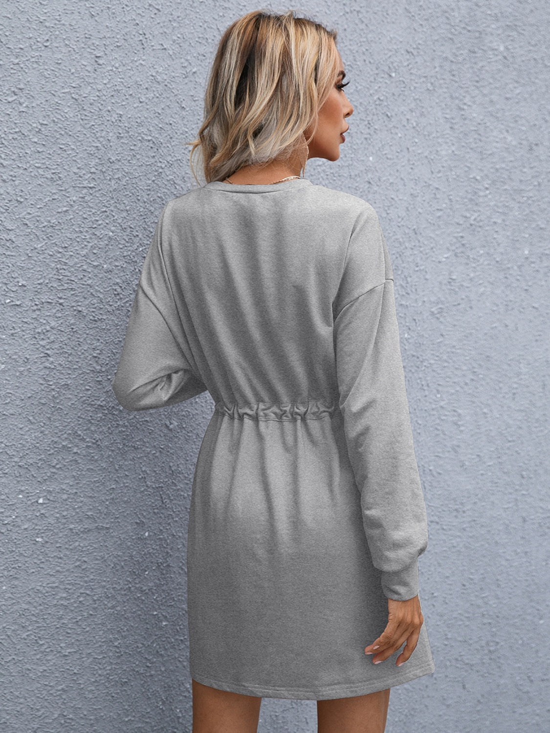 Drawstring Round Neck Dropped Shoulder Mini Dress