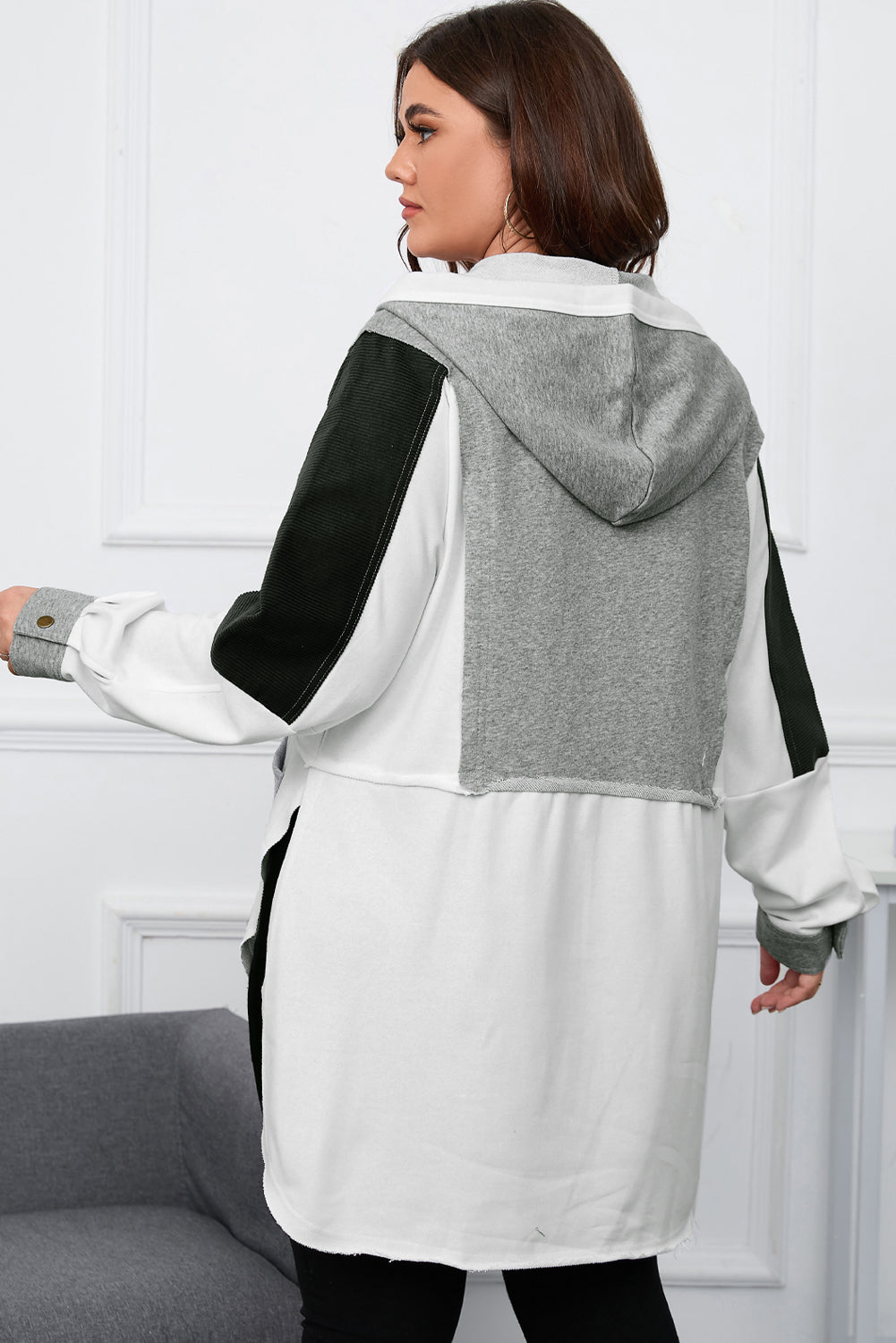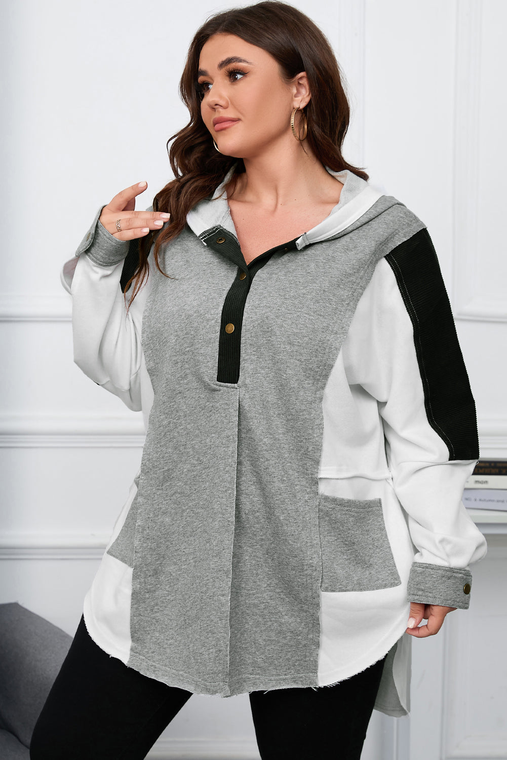Plus Size Slit Color Block Half Snap Hoodie