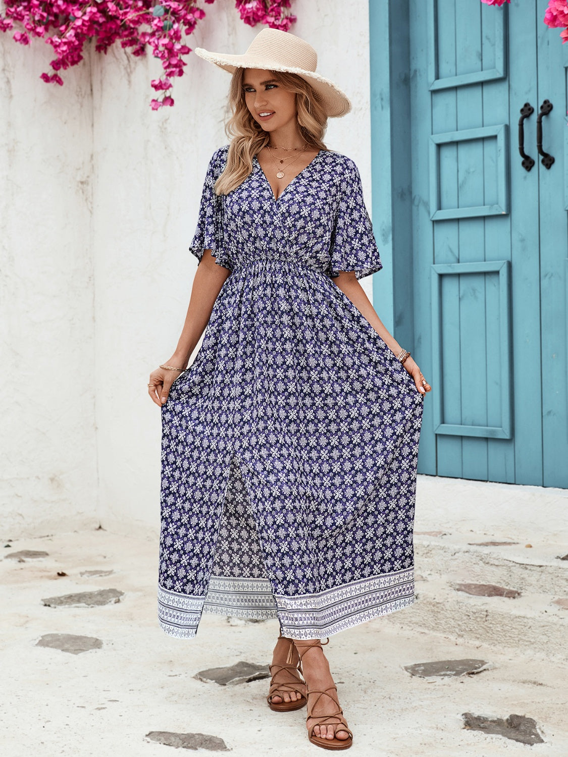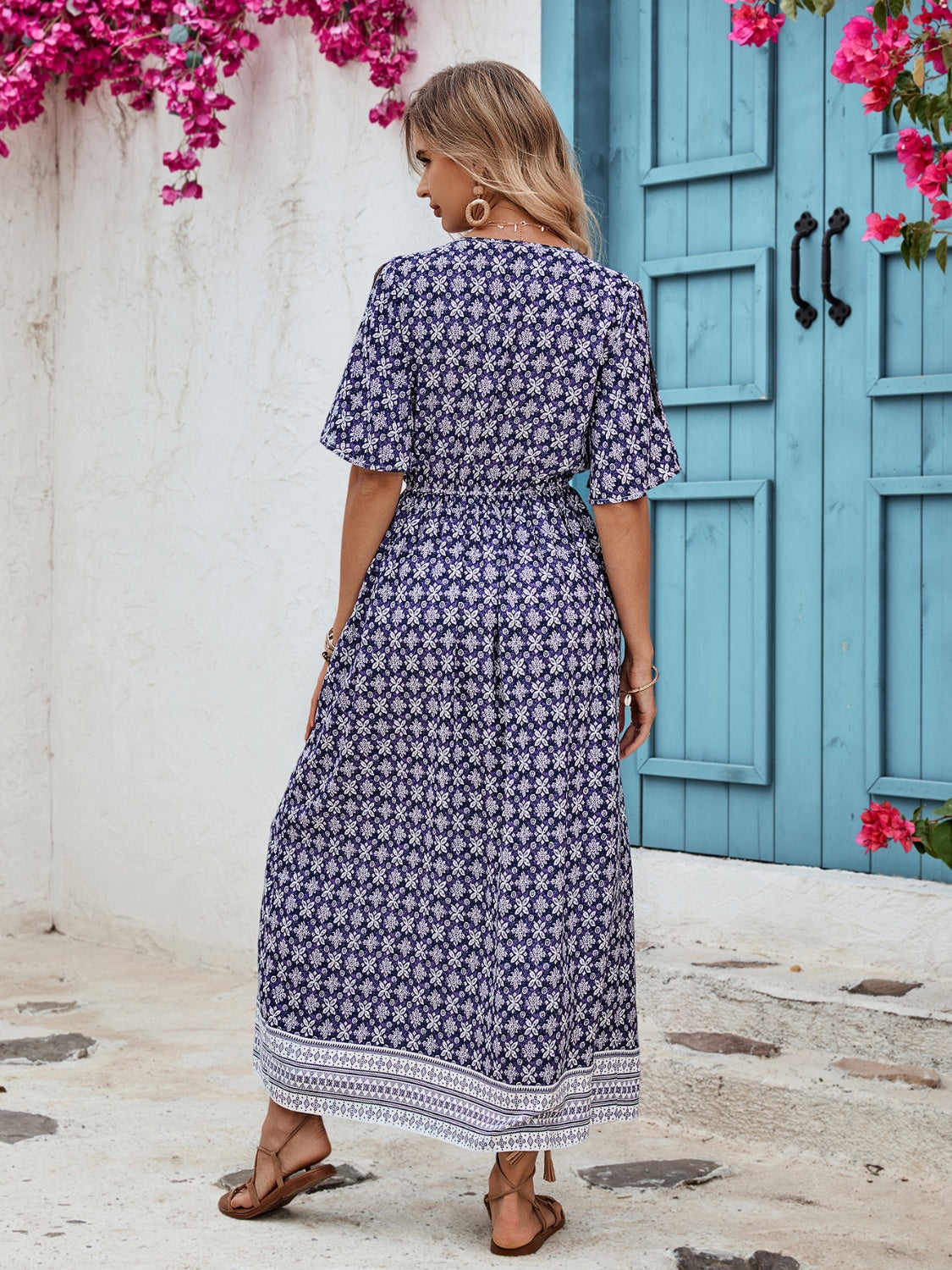 Slit Printed V-Neck Half Sleeve Dress